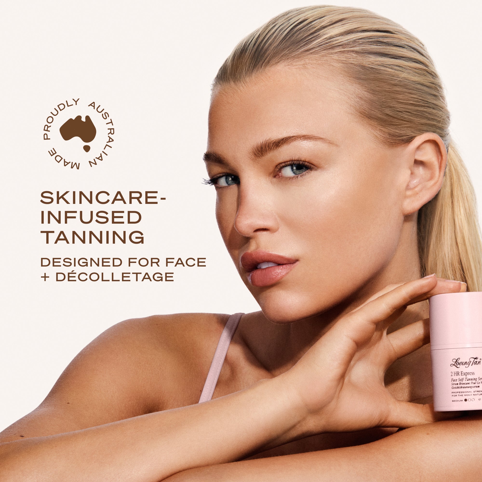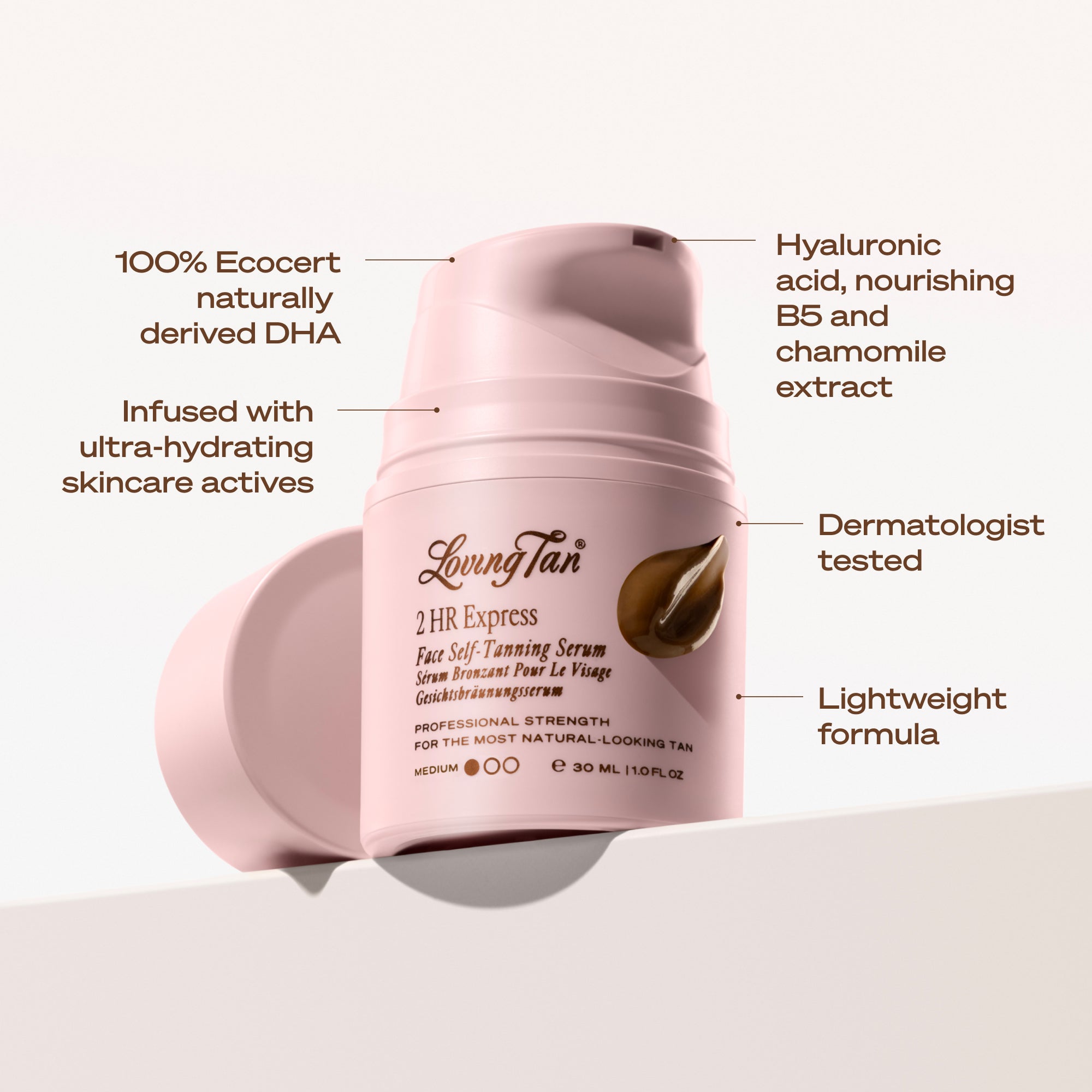 2 HR Express Face Self-Tanning Serum has a gentle formulation created specifically for use on your face and décolletage. The lightweight formula is infused with skincare ingredients like ultra-hydrating hyaluronic acid, nourishing B5 and soothing chamomile extract and are all dermatologist tested.As with all topical products, we recommend patch testing on a small area to ensure it is suitable for your skin type or speaking with your dermatologist before use.