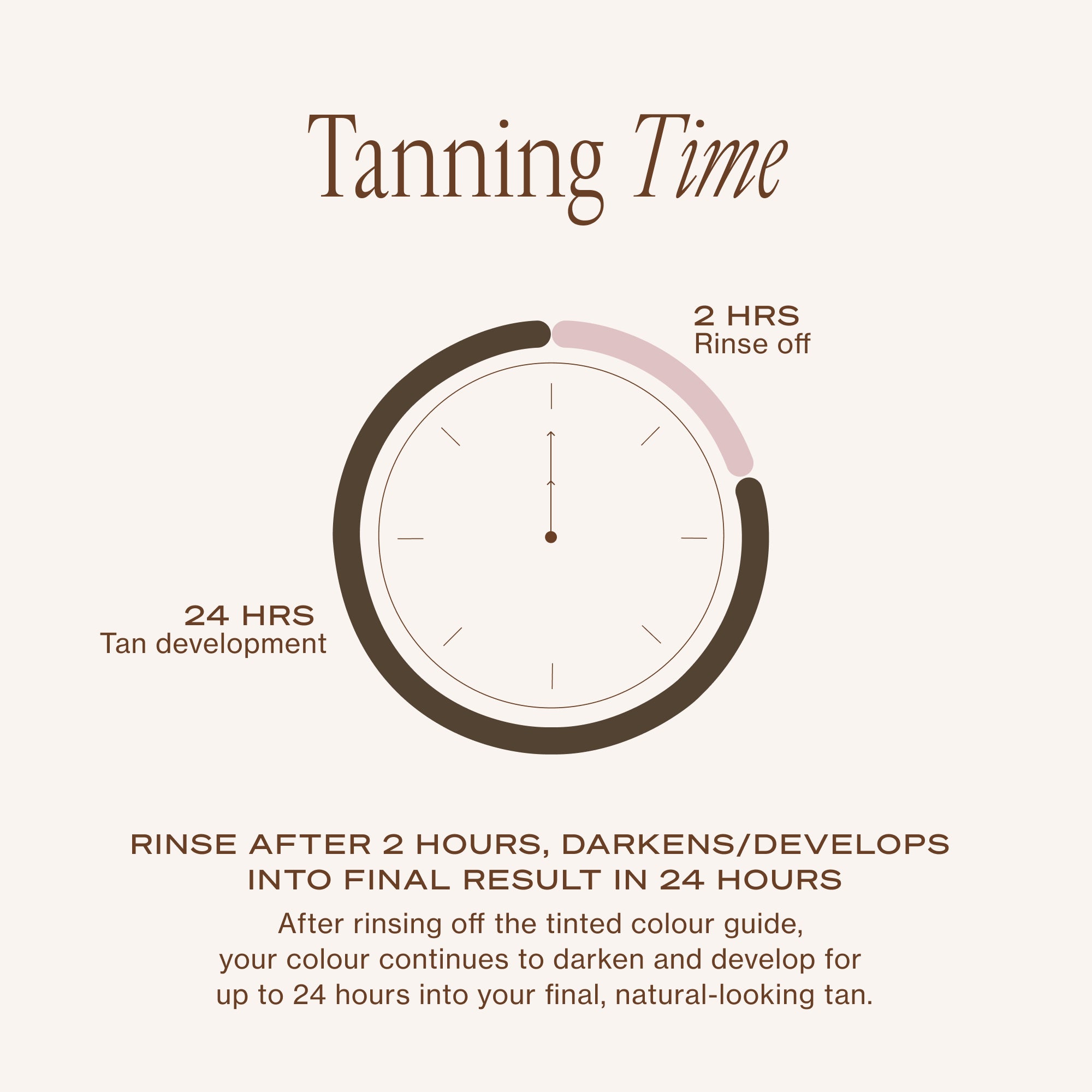 You will see visible results after rinsing off the tinted colour guide after two hours. The active tanning ingredients will continue to develop your final tan into a deeper, natural shade over the next 24 hours.